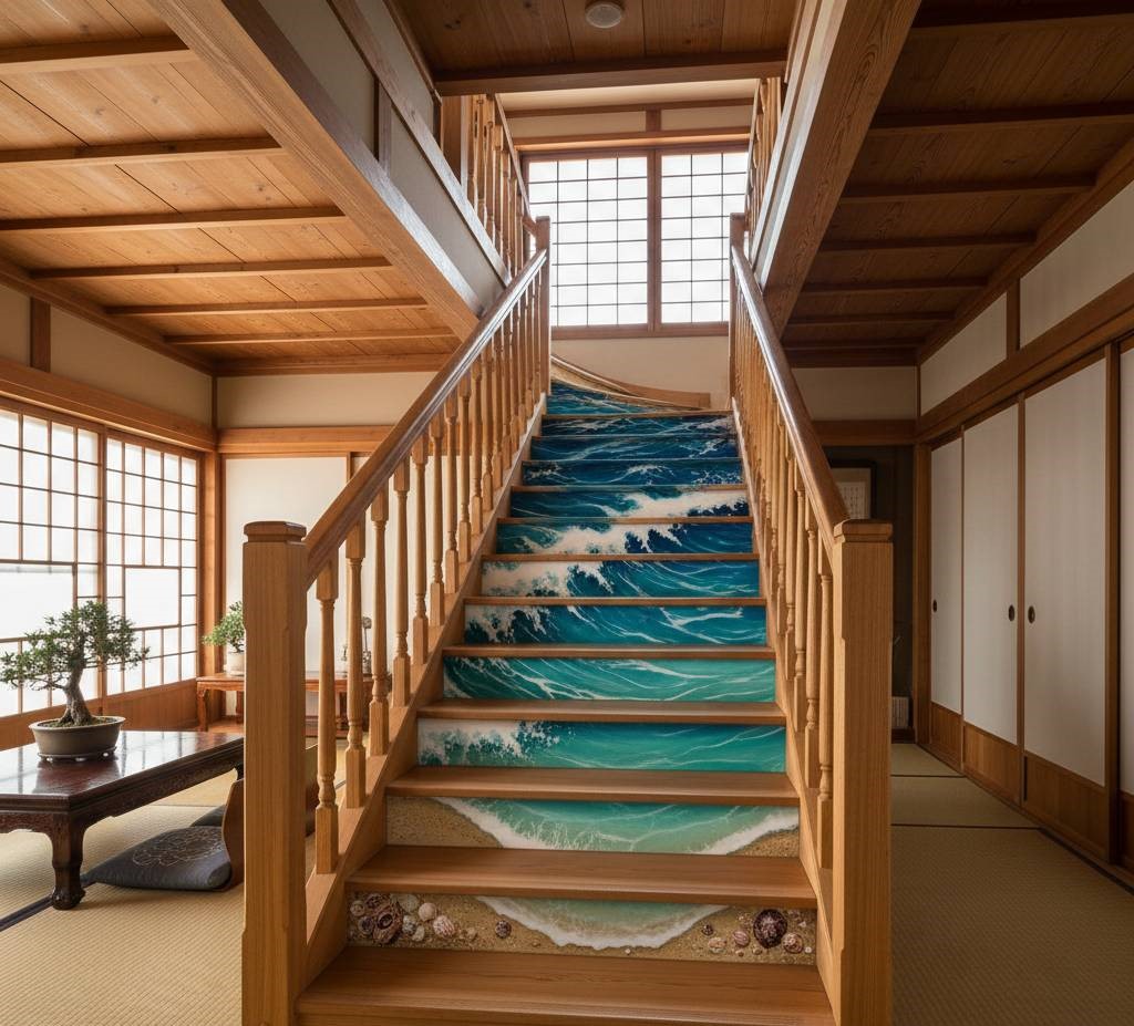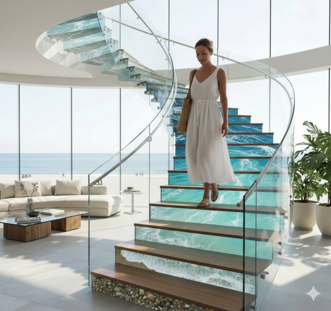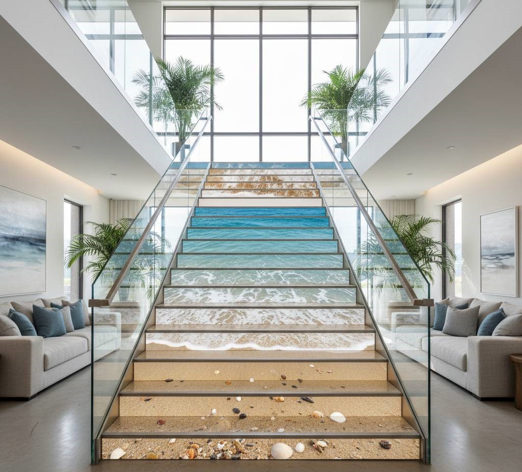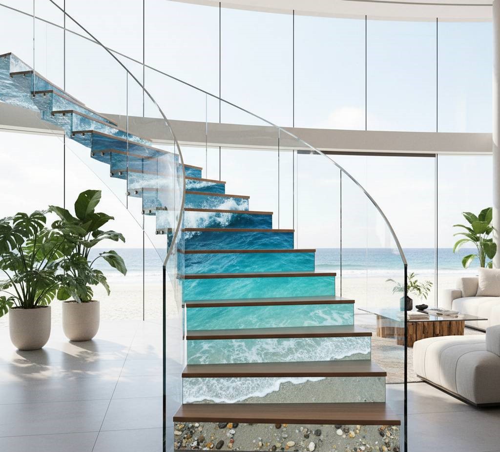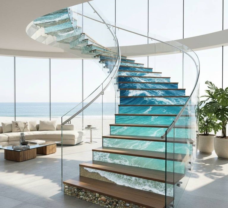 These staircases blend seamlessly with cliffside homes or elevated properties, using curved railings and open treads that mimic the flow of ocean waves. The design ensures a natural transition from home to beach, enhancing architectural harmony.