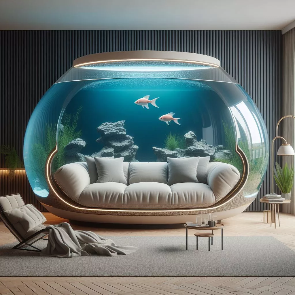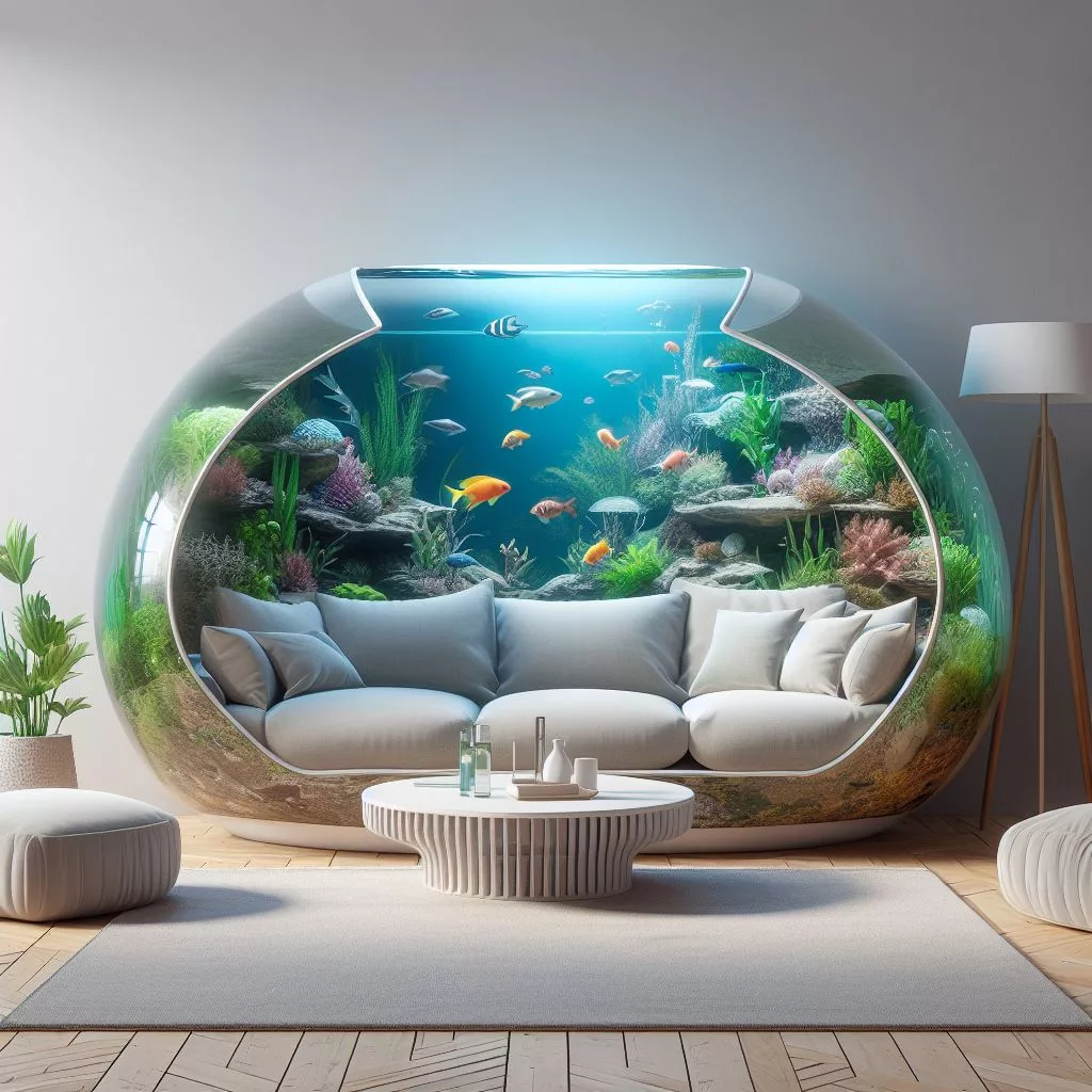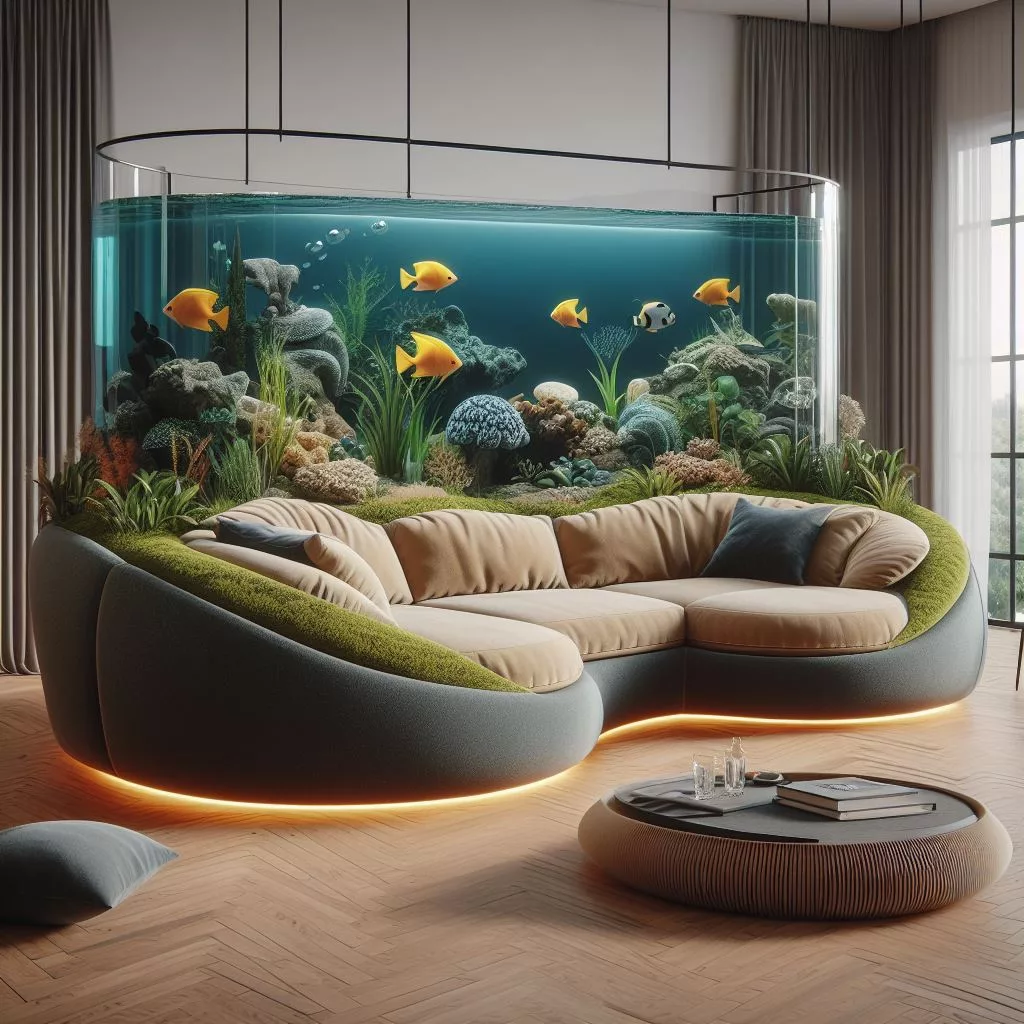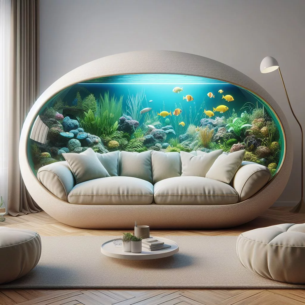 Designers blend the fluidity of an aquarium with the structure of a sofa, crafting a harmonious balance that offers both a visual spectacle and a cozy seat, bridging the gap between natural wonder and everyday relaxation.