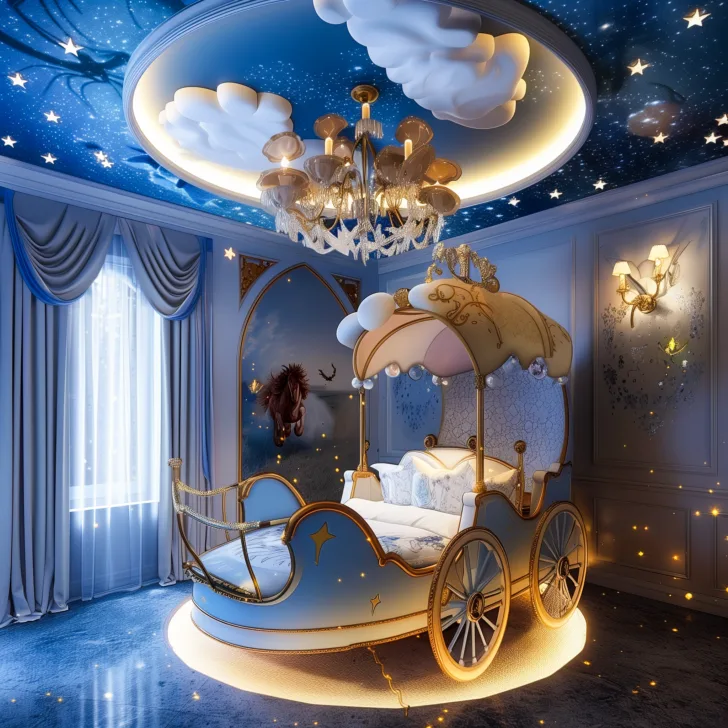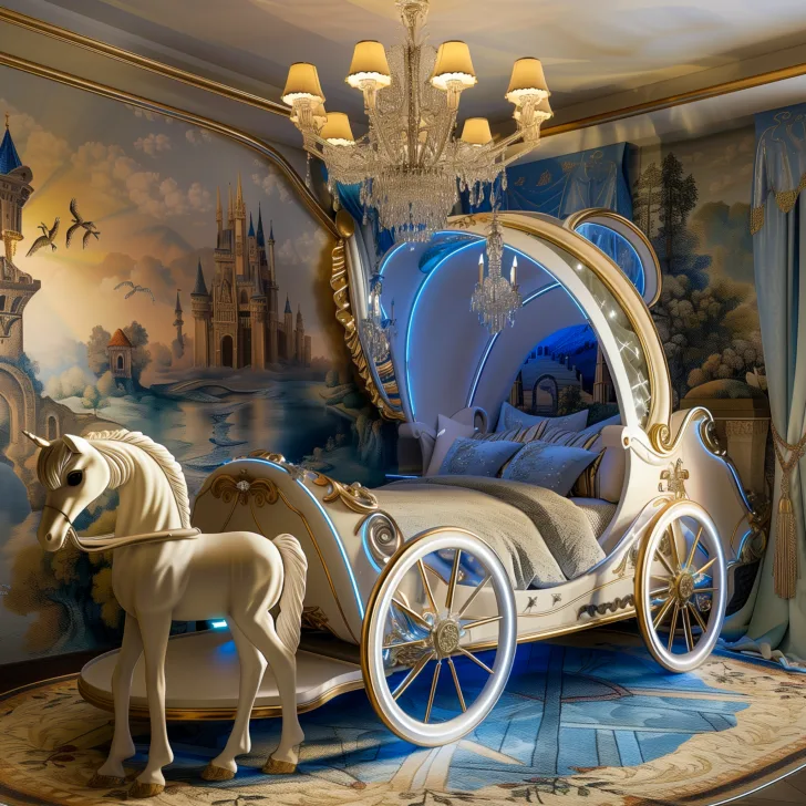 Oversized pumpkin-shaped headboards, golden wheels, and crystal accents instantly transport sleepers into classic fairy-tale romance.
