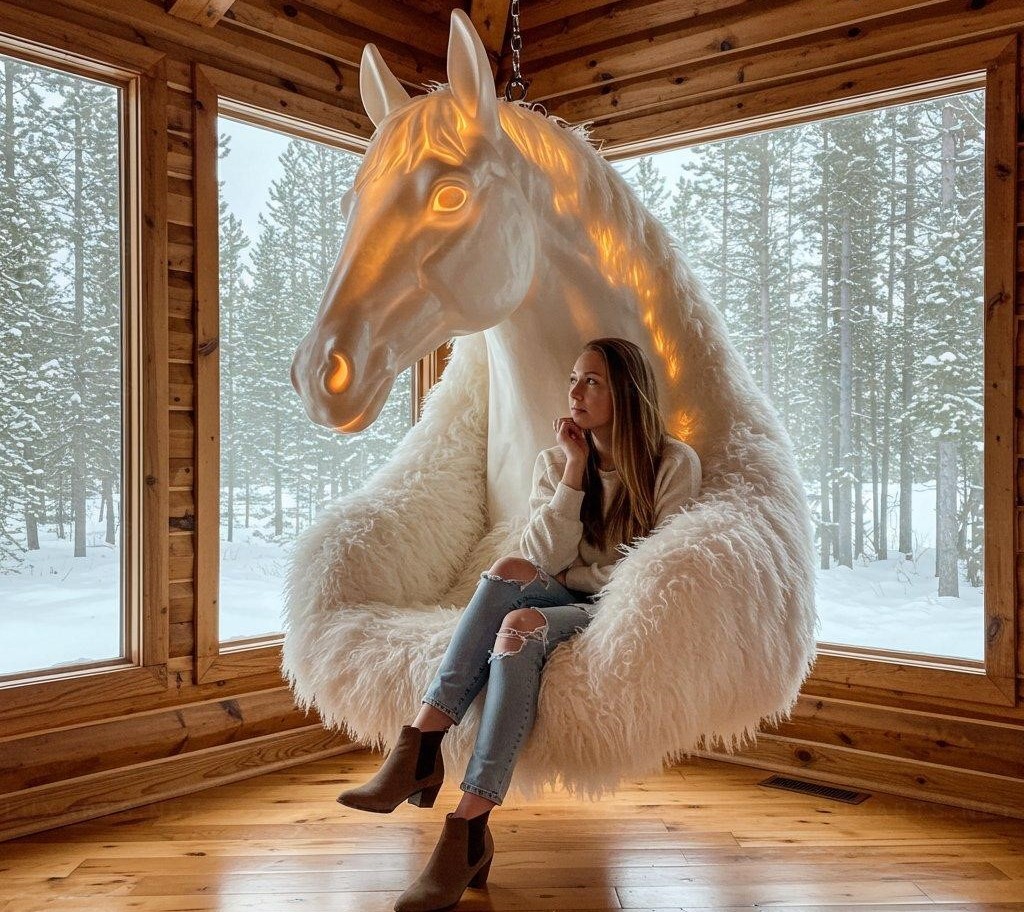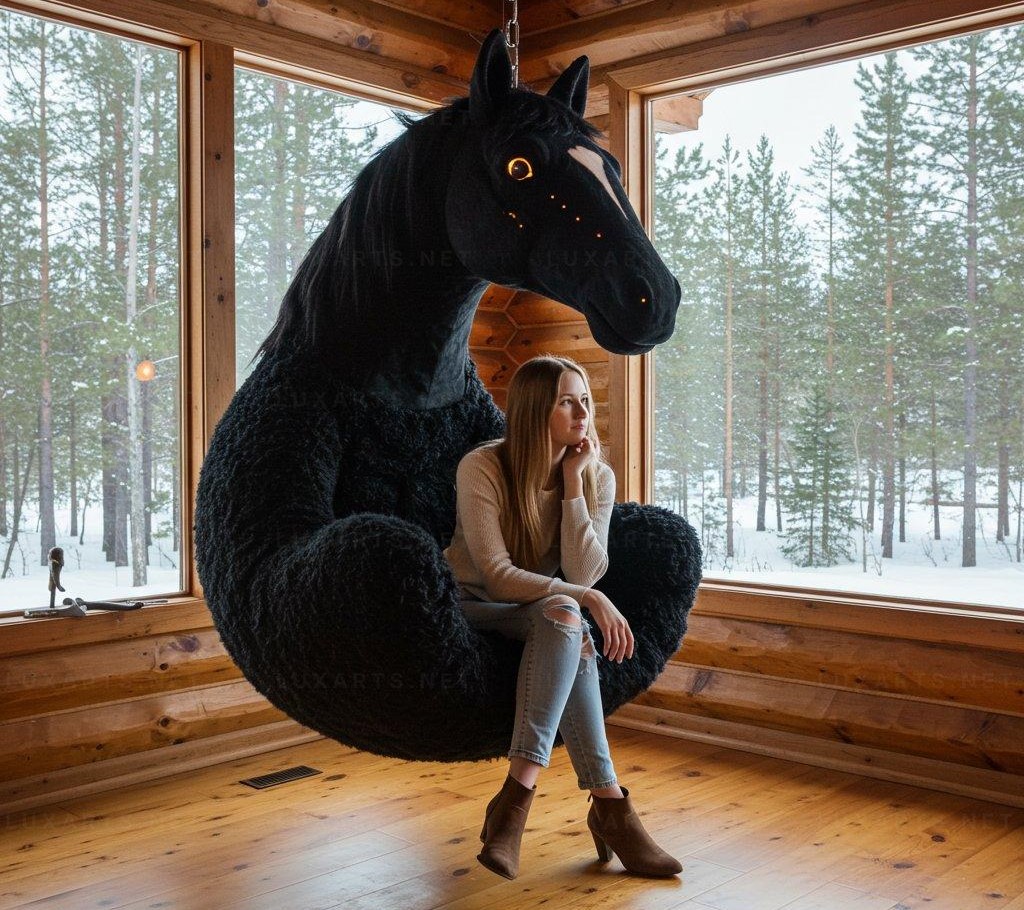 Designers merge the organic curves of a horse’s form with ergonomic seating, using suspended structures to create a floating, hammock-like experience that combines artistic expression with ultimate relaxation for lounging or reading.