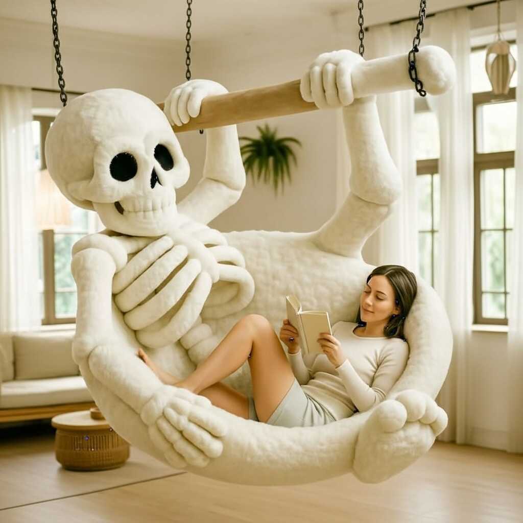 In the mesmerizing realm of dark décor and cozy outdoor living, the Skeleton Themed Lounge Swing rises from the shadows as a hauntingly beautiful fusion of macabre art and luxurious comfort. Crafted to look like a giant skeletal frame with ribcage backrest, skull headrest, and bone-shaped chains, this hanging egg chair transforms porches, patios, and gothic living rooms into a dramatic relaxation throne. Perfect for Halloween lovers, goth enthusiasts, alternative couples, or anyone craving a bold statement piece, it blends weatherproof materials, plush cushioning, and eerie aesthetics to deliver spine-tingling style with spine-supporting comfort.