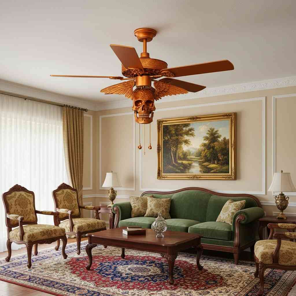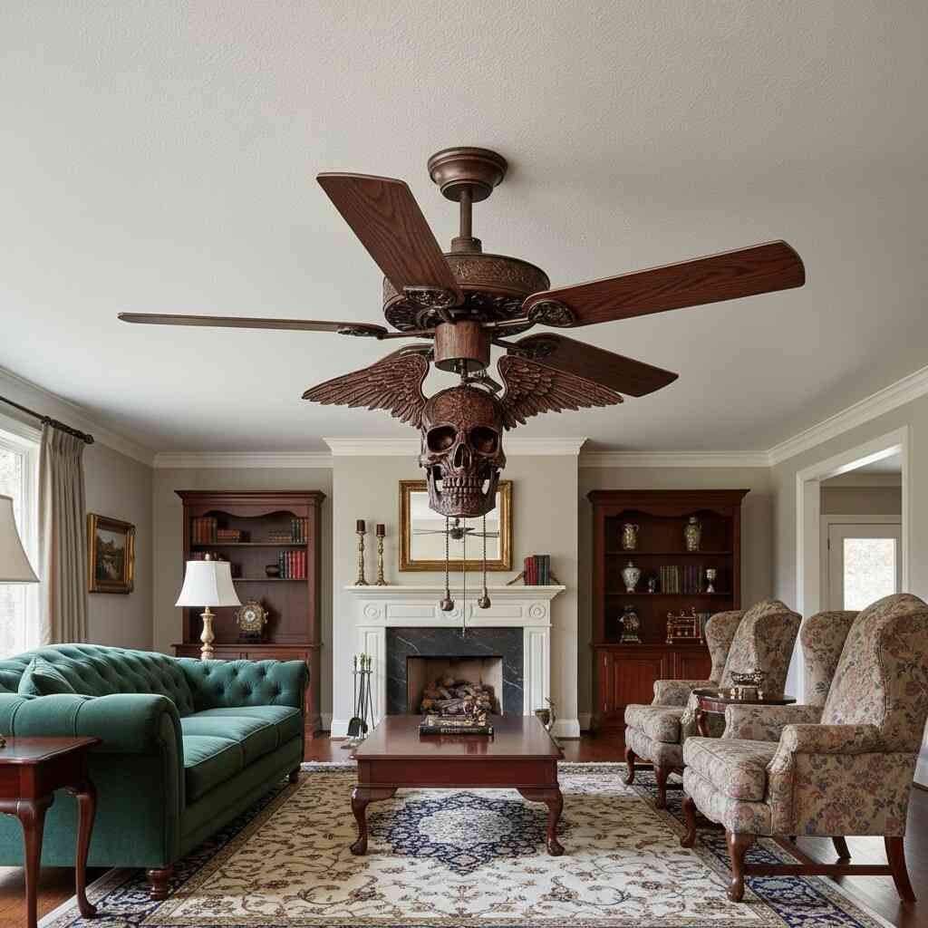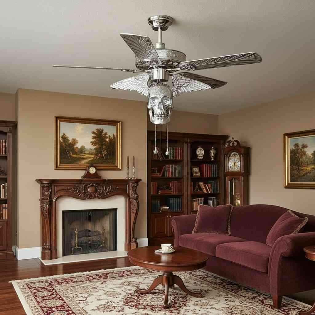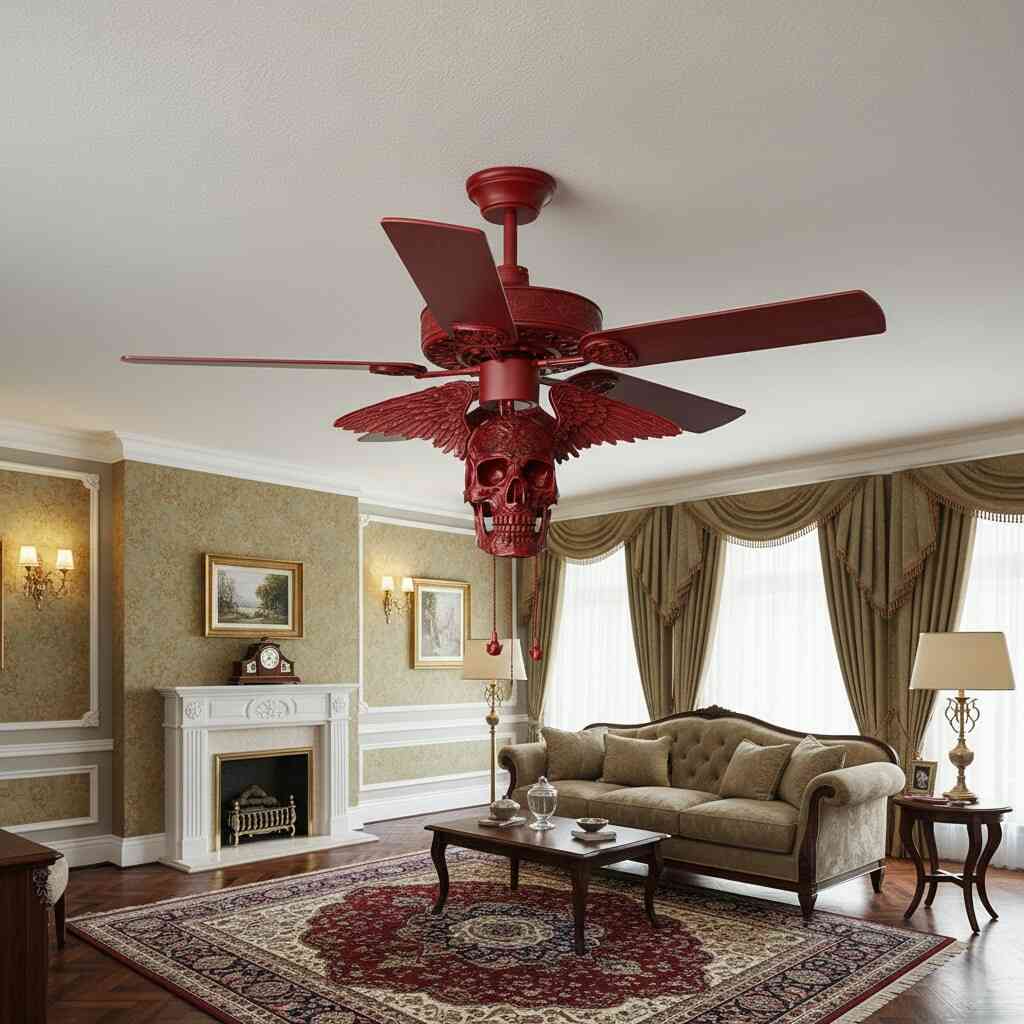 Ceiling fans are typically chosen for practicality, often fading into the background of a room. A skull-themed design disrupts this expectation entirely. Suspended above, it commands attention and reshapes how the ceiling itself is perceived. Rather than an overlooked surface, the upper plane of the room becomes a canvas for creativity and storytelling.
